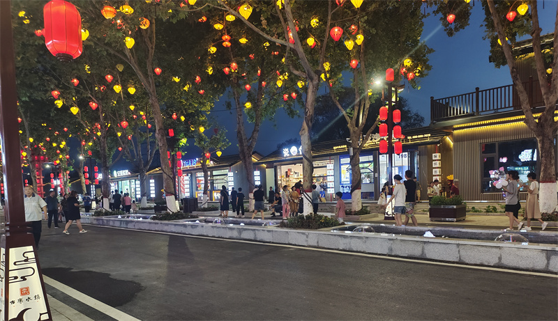 此款售貨亭造型美觀,款式新穎,造型上設(shè)計為豎條紋,顏色采用的是深棕色,在暖色燈光的照射下,讓材質(zhì)凸顯的更加有質(zhì)感,讓整體效果看上去更加高端這是一整條的商業(yè)街,夜間燈火通明,兩邊的大樹纏繞著紅紅火火的燈籠,讓整條街都顯得十分有氛圍感